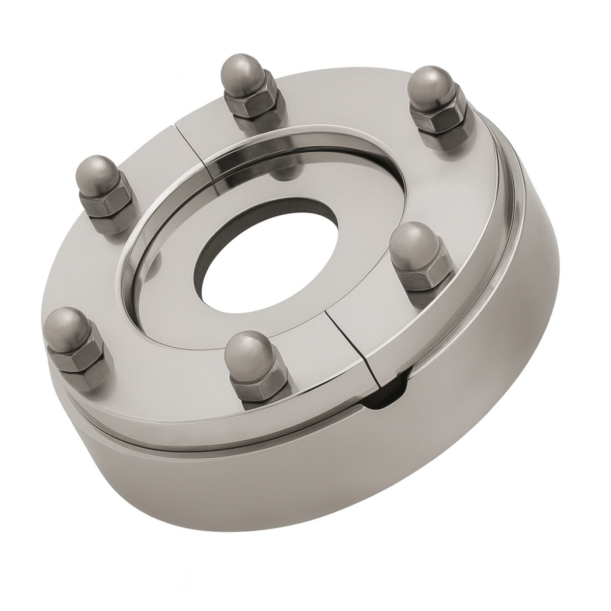 Assembly: Metal-fused glass ring with permanent compressive pre-stress (no glass/gasket creep)